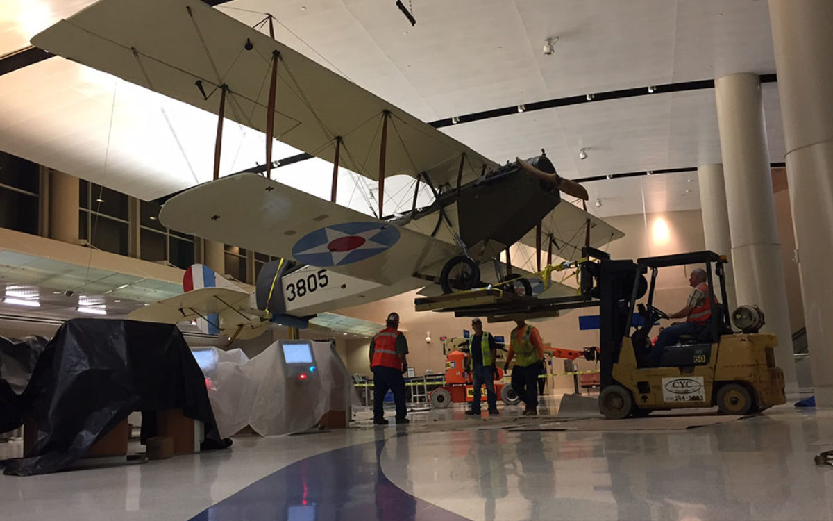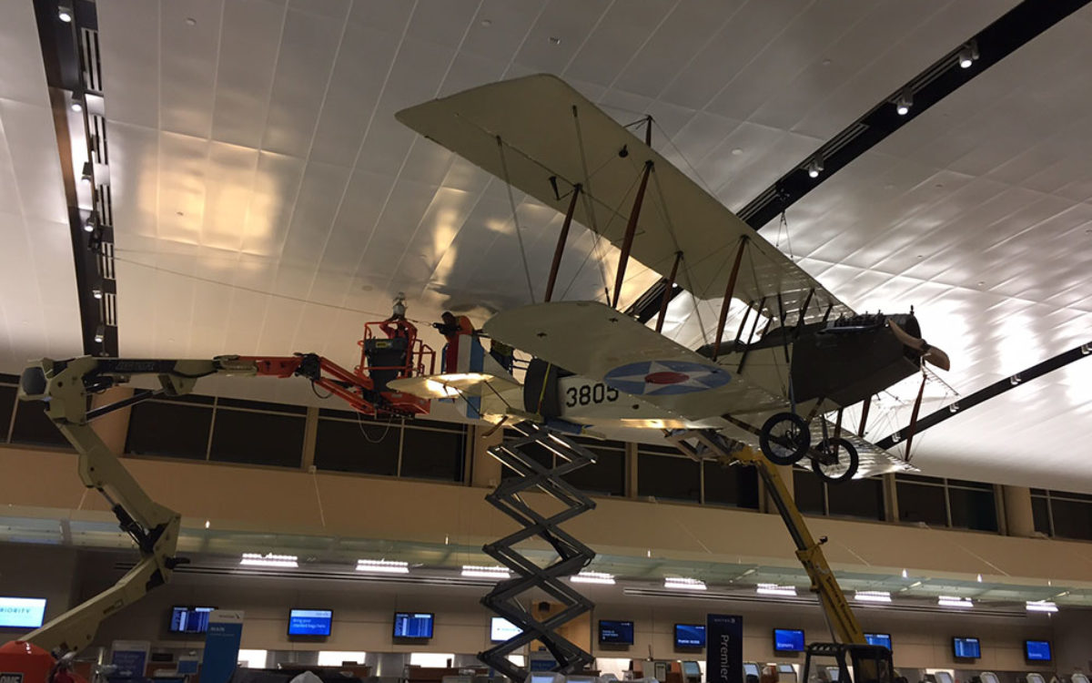 Alpha was excited to partner with both the Witte Museum and The San Antonio International Airport to get the “Jenny” safely assembled and hung inside the terminal. Alpha had been involved in the planning of this project for almost a year. There was a very narrow window of time to complete the project due to coordination of availability between the Whitte Museum and the plane assemblers. Another challenge was working around the airline ticket counters in Terminal B. Work could only be done at night when the counters were closed, giving Alpha an average of 6 hours to work per night.