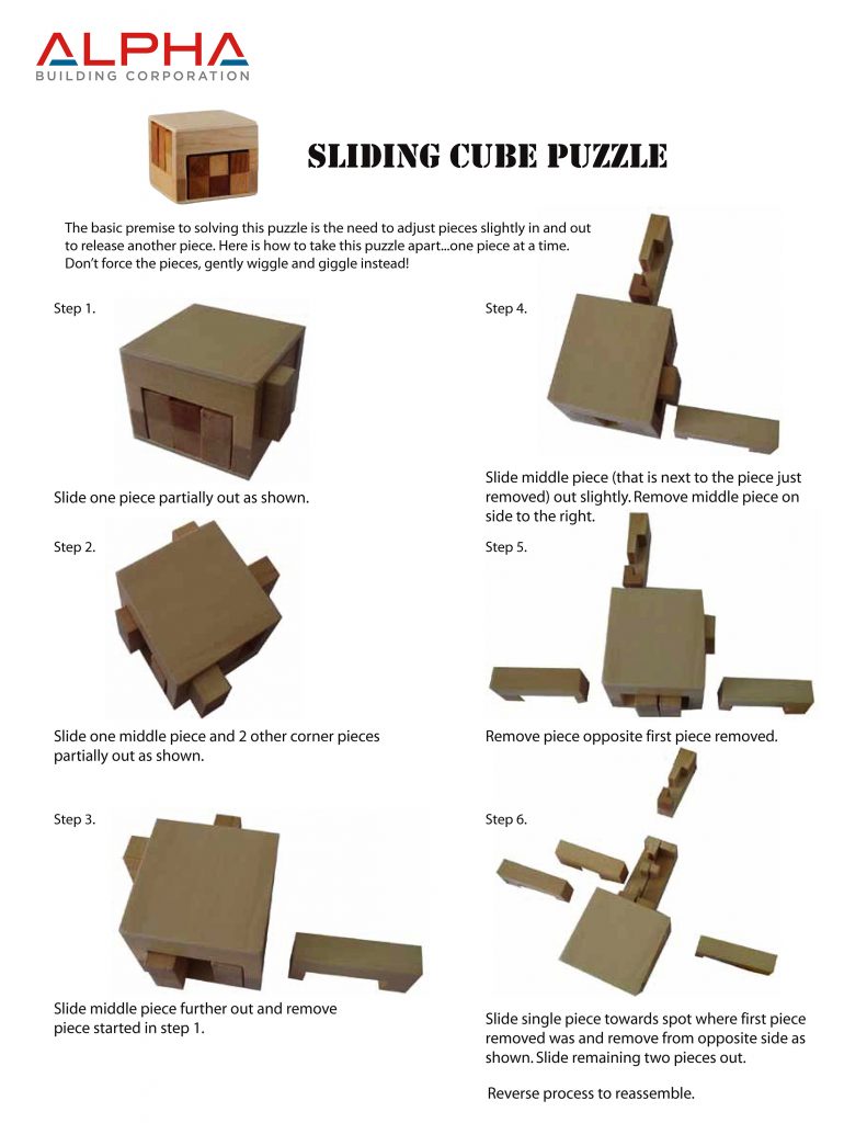 September 29, 2016 by Lauren Daniel in Alpha News If you attended the Texas College & University Facilities Professionals Conference September 28-30, 2016 in Houston, Texas, you might have picked up one of our wooden puzzle cubes. The solution is below. We hope you had fun with it! (click to enlarge) 6 Recommend Share Alpha Building Corporation Construction Manager General Contractor Tagged in